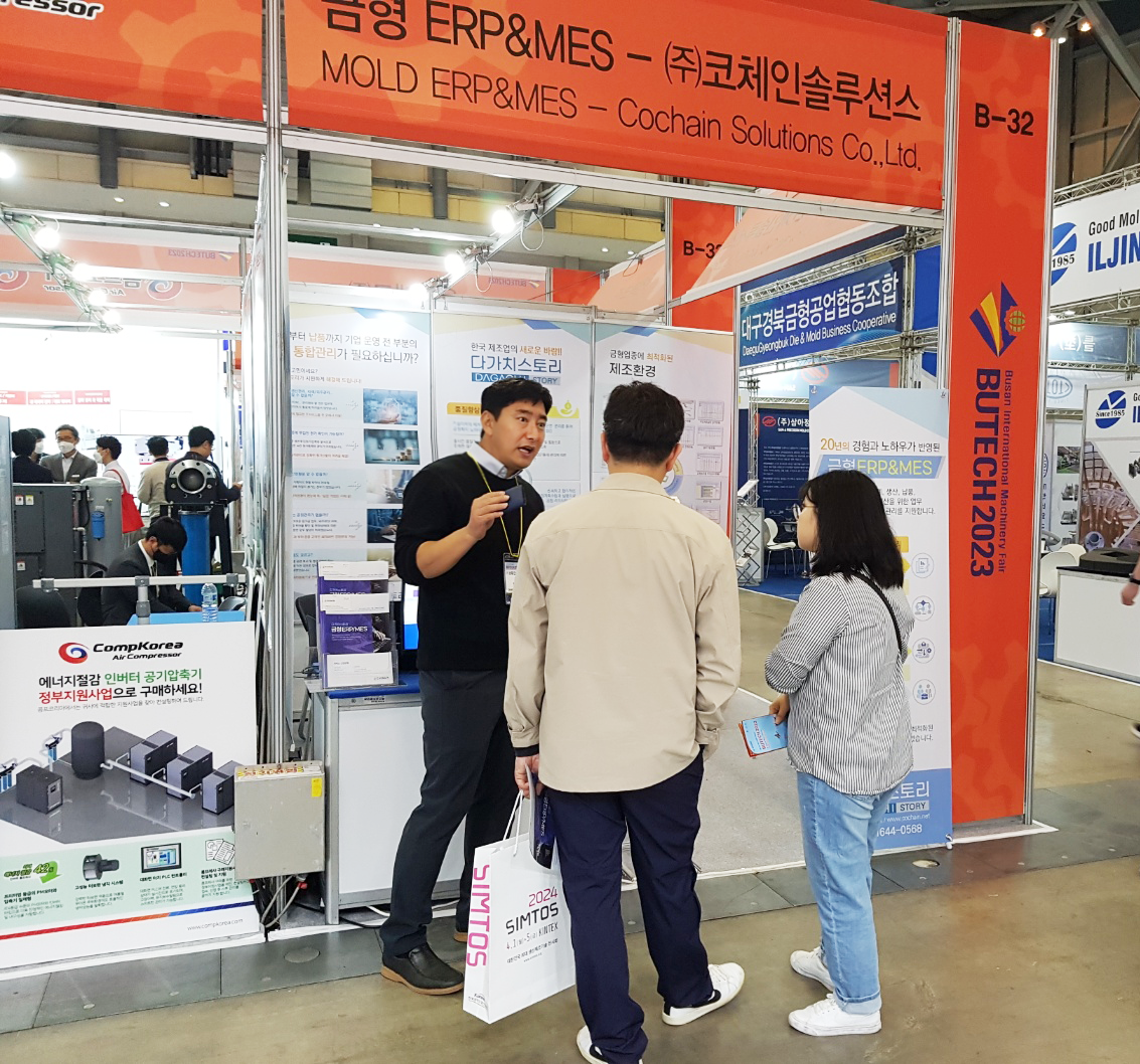 저희 코체인솔루션스는 부산경남금형공업협동조합 조합원으로 조합부스 내에서도 저희 금형ERP, MES 시스템을 소개해드렸습니다.
